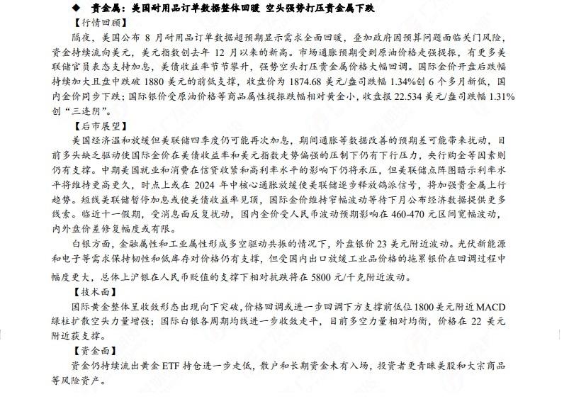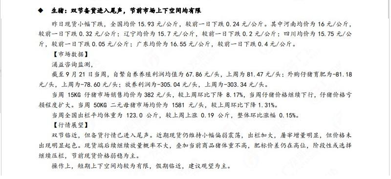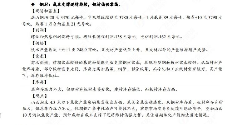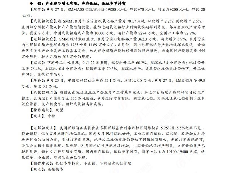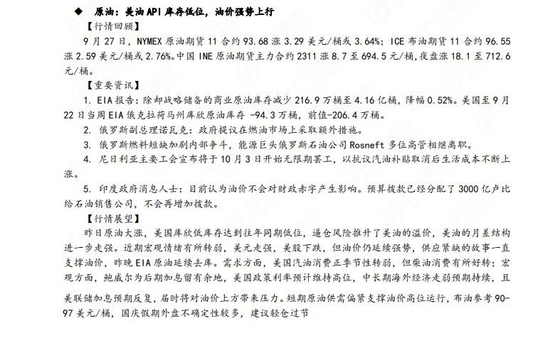 广发期货发布9月28日早知道,建议铝低位多单持有,小止损,节前注意仓位管理;预计成材在成本支撑下还将维持偏强走势;焦煤盘面将继续表现强势,除了单边策略外,可以关注多焦化利润的策略;短期原油供需偏紧支撑油价高位运行,布油参考90-97美元,国庆假期外盘不确定较多,建议轻仓过节。