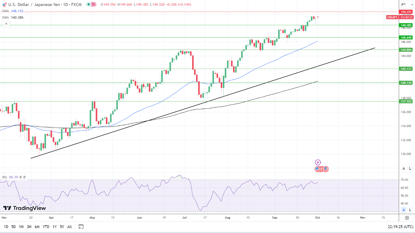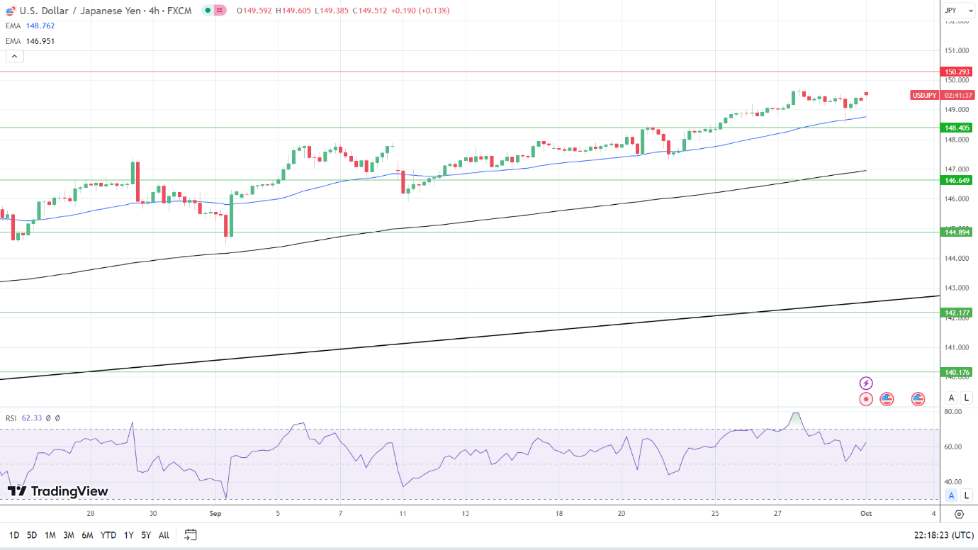然而,美元/日元跌破50日均线将使148.405支撑位发挥作用。14-4小时RSI为62.33,表明美元/日元在进入超买区域之前将回到150。