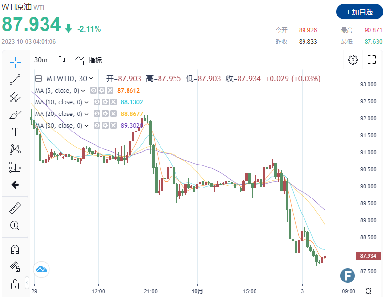 与此同时,WTI原油下跌2.11%,收于每桶87.934美元。