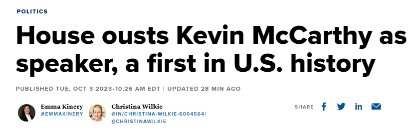 标题:突发!美国众议院投票决定罢免议长麦卡锡,为史上首次