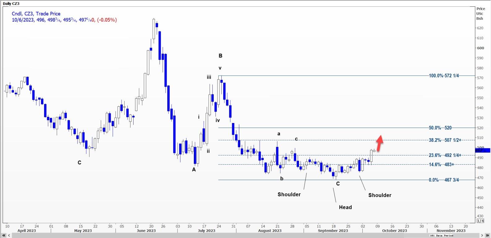 回撤分析标记目标区域为5.07-1/2美元至5.20美元。头肩倒转形态已得到确认,目标位为5.15美元。
