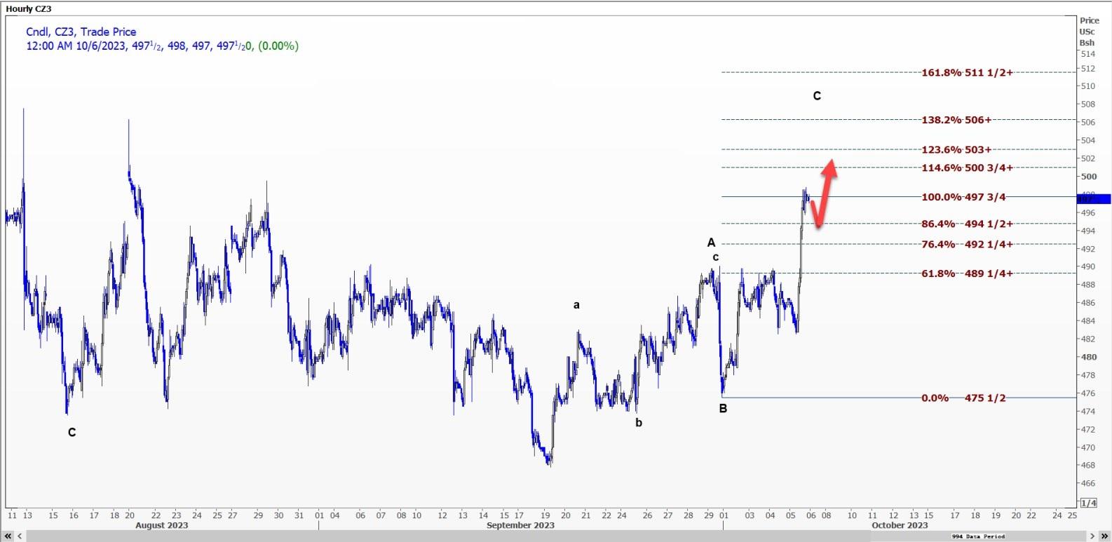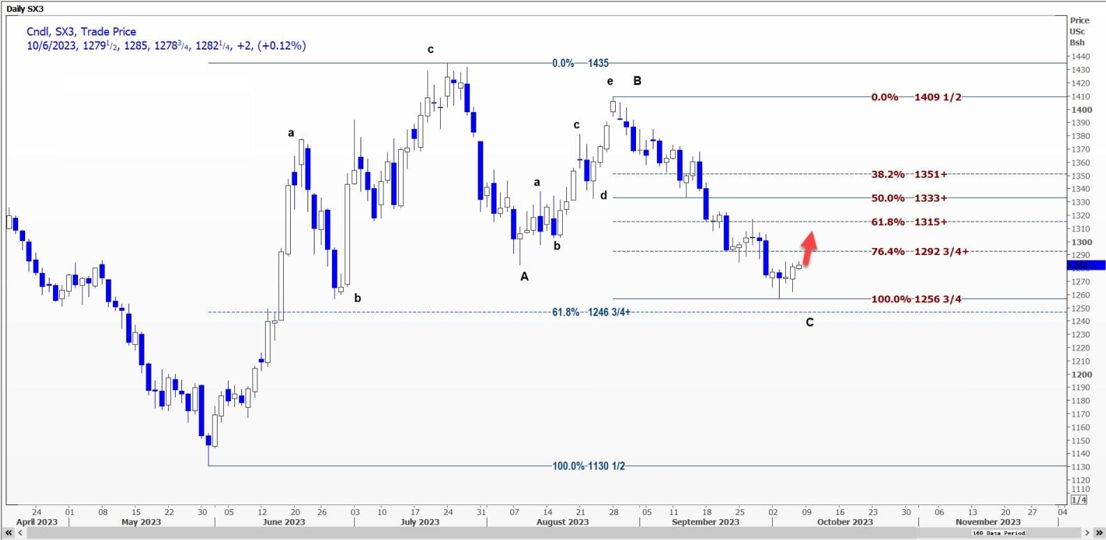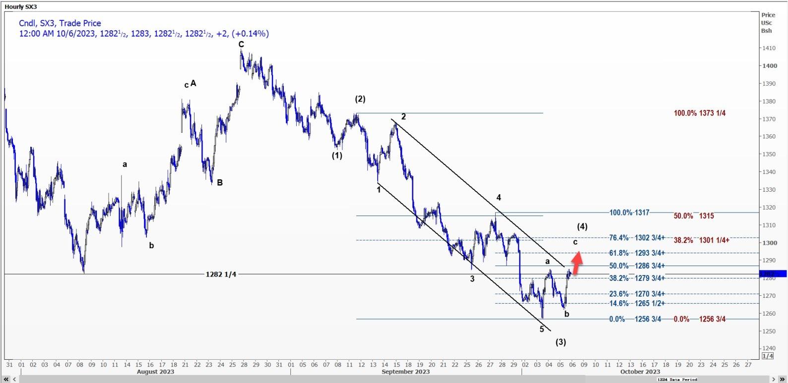 该合约正处于(4)浪上,正在向13.17美元附近的第4浪峰值移动。如果未能突破12.86-3/4美元,下跌趋势可能会持续。