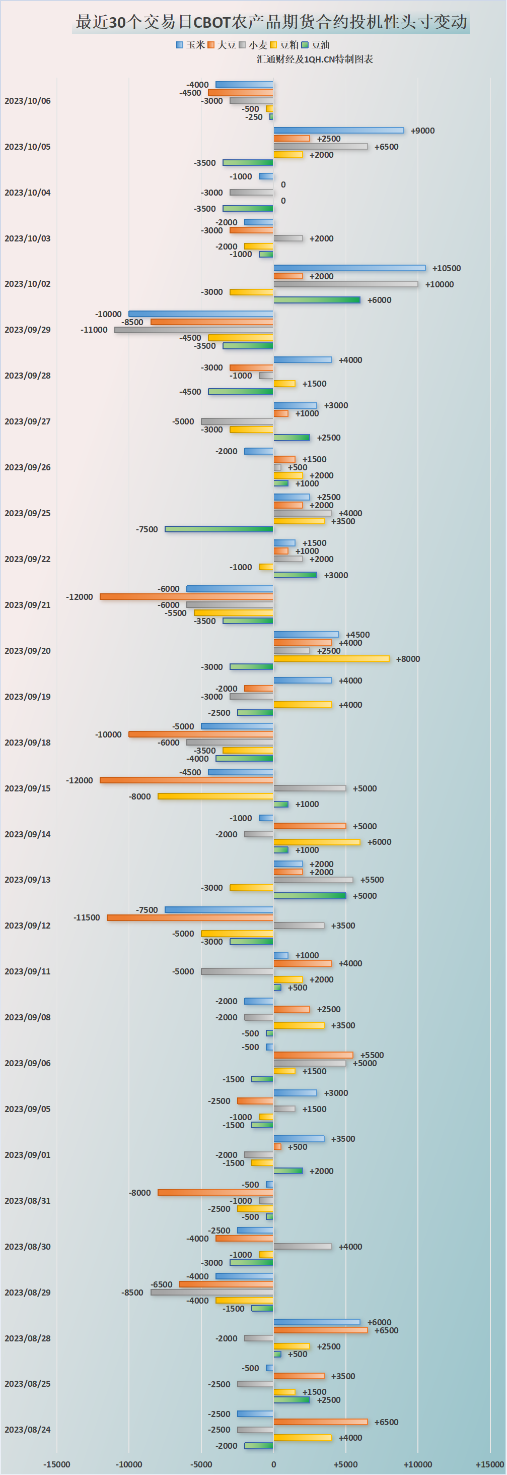 汇通财经APP讯——交易商估算的结果显示,大宗商品基金10月6日增加大豆、玉米、小麦、豆油、豆粕投机性净空头寸。本周大宗商品基金增加玉米、小麦净多头头寸,增加大豆、豆粕、豆油净空头头寸。最近30个交易日,大宗商品基金增加大豆、玉米、小麦、豆油、豆粕投机性净空头寸。