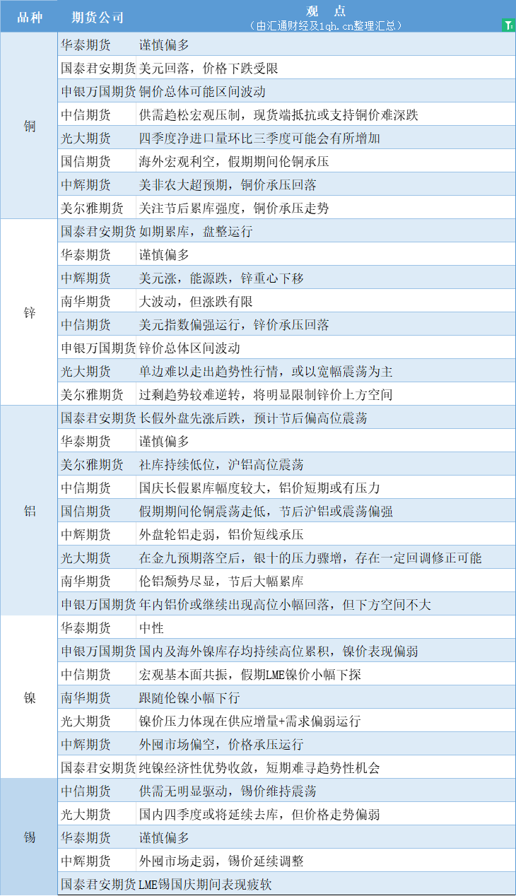 标题:期货公司观点汇总一张图:10月9日有色系(铜、锌、铝、镍、锡等)