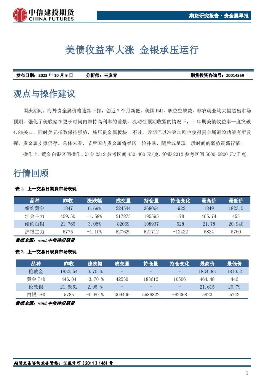 标题:中信建投期货10月9日贵金属报告:美债收益率大涨 金银承压运行