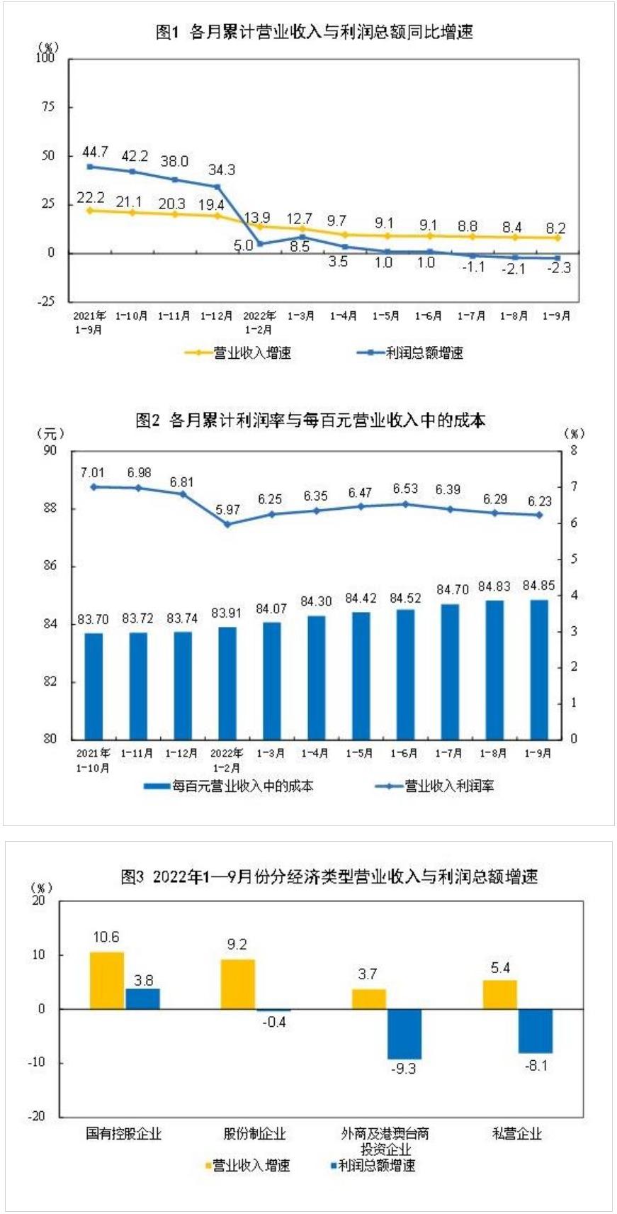 1—9月份,规模以上工业企业每百元营业收入中的成本为84.85元,同比增加1.06元;每百元营业收入中的费用为7.92元,同比减少0.51元。