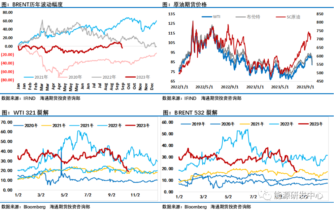 一方面原油市场供应偏紧局面短期仍难以缓解, 10月4日沙特阿拉伯重申了自愿减产100万桶的计划至今年年底,俄罗斯方面同样表示将保持10月份石油出口低于基线30万桶/天。二国均强调减产措施是加强欧佩克+国家为支持石油市场的稳定和平衡而做出的预防努力,另外俄罗斯副总理诺瓦克称俄罗斯将在下个月重新审议减少出口的决定。原油市场月间差比绝对价抗跌的表现显示供应紧张仍是现阶段客观现实,而原油低库存局面短期难以缓解,在接下来四季度仍然会支撑油价,让油价维持在相对偏强区域。但这一因素在过去2个多月的上涨过程已经不断被市场计价,对油价上行驱动能量逐渐消耗。且在周末传出消息称沙特向美国白宫透露其石油产量意向,称如果原油价格走高,愿意在明年初提高石油产量。沙特和美国官员表示,此举旨在推动沙特与以色列关系正常化的协议。根据该协议,沙特将承认以色列,作为回报,美国将与沙特签订防务协议;该协议可能还包括美国的核援助,并代表着沙特的显著转变。一年前,沙特方面拒绝了拜登政府帮助降低油价和抗击通胀的呼吁,导致两国关系严重紧张。不过,沙特谈判代表强调,任何产量行动都将取决于市场条件,这或许会让投资者对供应端保持警惕。另外周末突发的巴以冲突再次让投资者紧绷神经,在当前供应端减产背景下,地缘因素出现随时可能再次推动油价上行,巴以冲突进展也将是是接下来市场会密切关注的因素。随着油价进入高价区之后,金融市场面临的宏观因素及原油市场另一侧需求端的让市场担忧的表现影响在变大,除欧美柴油紧缺仍相对强势,全球成品油裂解差普遍回落明显,显然需求侧难以匹配油价的强势,这也开始逐渐拖累原油表现。