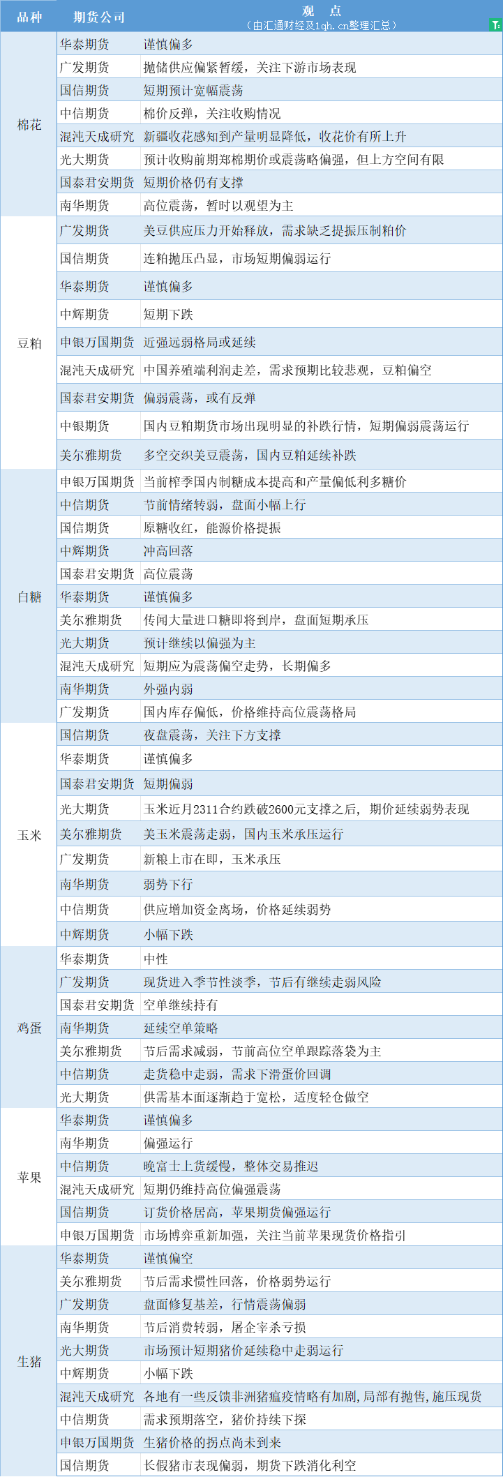 标题:期货公司观点汇总一张图:10月10日农产品(棉花、豆粕、白糖、玉米、鸡蛋、生猪等)