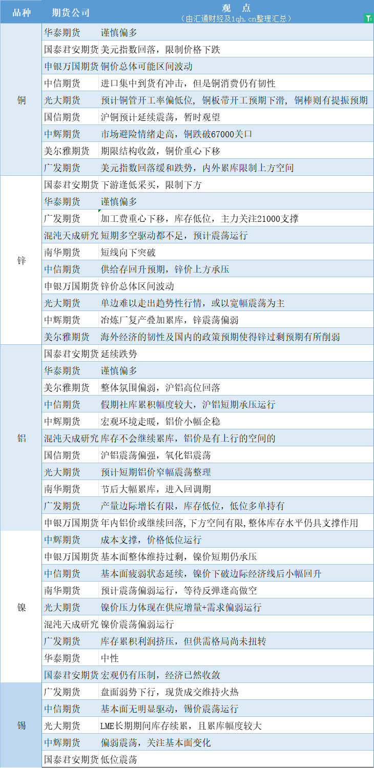 标题:期货公司观点汇总一张图:10月11日有色系(铜、锌、铝、镍、锡等)