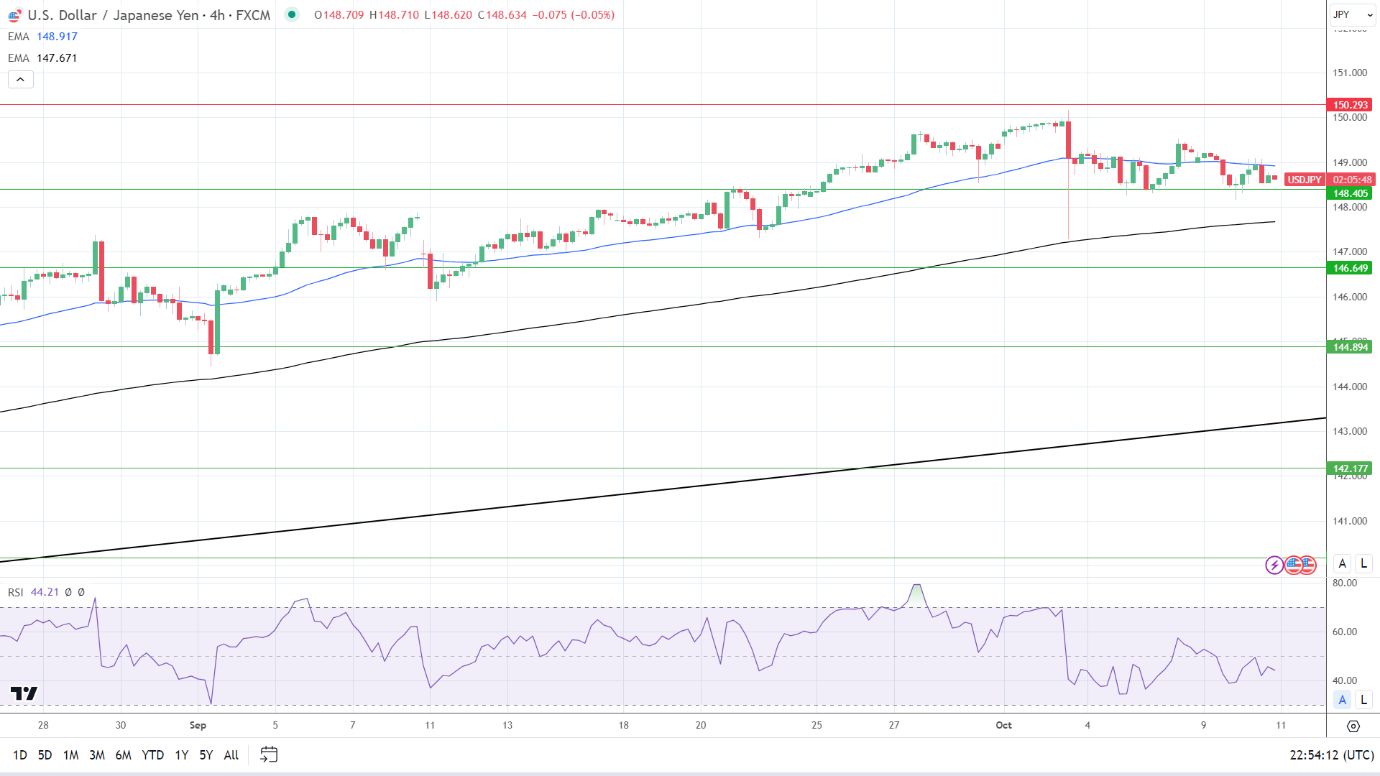 4小时图上看,美元/日元仍低于50日均线,同时高于200日均线,发出近期看跌但长期看涨的价格信号。跌破148.405支撑位将使200日均线发挥作用。