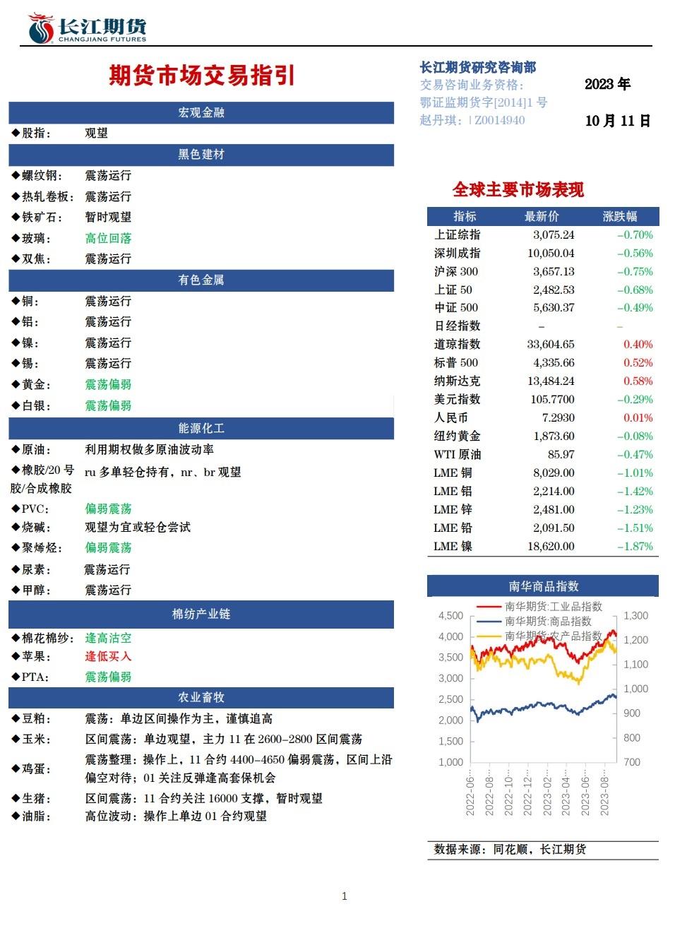 长江期货10月11日期货市场交易指引