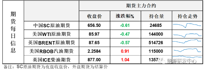 【1】WTI主力原油期货收跌0.41美元,跌幅0.47%,报85.97美元/桶;布伦特主力原油期货收跌0.5美元,跌幅0.57%,报87.65美元/桶;INE原油期货收跌0.61%,报656.5元。
