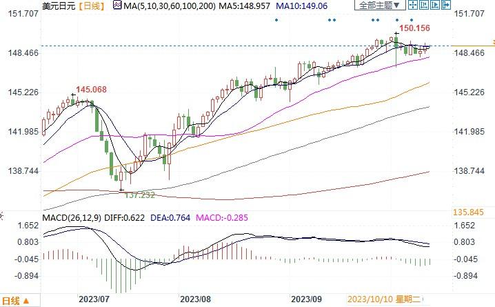 周三(10月11日),美元/日元在在横摆中再次将收盘价推升至149楼上。近期,以巴冲突紧张局势增加了对日元的需求,但国际货币基金组织(IMF)警告,全球复苏依然缓慢,日本2024年国内生产总值(GDP)增长展望为1%,低于发达经济体预计的1.4%。美国加息前景、油价飙升和日本大型制造商士气低迷,3大利空联袂压制日元走势,疲弱的数据可能迫使日本央行维持负利率的超宽松政策。上述几大利空消息恐怕成为长期牵制日元表现的不利因素。继续留意周四晚间美国9月份CPI通胀发展情况所带来的市场影响状况。仅从技术图形来看,日线图上看,美元/日元位于50日和200日均线上方,确认了看涨的价格信号。而一旦跌破148.405支撑位,将支持朝50日均线水平146.649支撑位移动。4小时短线走势图上看,美元/日元仍低于50日均线,发出近期看跌的信号。