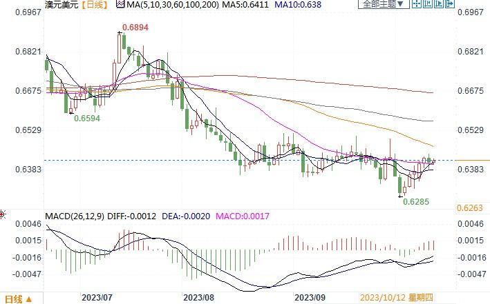 澳元兑美元有所回落,收盘在0.6413,但仍巩固住近期对美元的反弹涨势。澳新货币的反弹很大程度上归功于一些官员的评论,他们认为美国的利率可能已经见顶,这促使公债收益率回落。但是,来自澳洲央行的声音似乎很乐意继续暂停加息。为此,市场对澳洲央行再次加息的预期逐步减弱,目前认为澳洲央行在11月的下次会议上上调4.1%隔夜拆款利率的可能性仅为14%。而美元的利率前景仍处在模糊不清的状况之中,因此澳元想要获得继续上冲的动能似乎存在着较大的阻碍。留意晚间美国CPI通胀数据情况,若增长低于预期和前值,澳元/美元或有望上冲一线逼近布林带通道上轨线0.6485-0.6500价格区域。相反,若美CPI数据意外超强,不言而喻澳元恐会遭到抛压的打击。