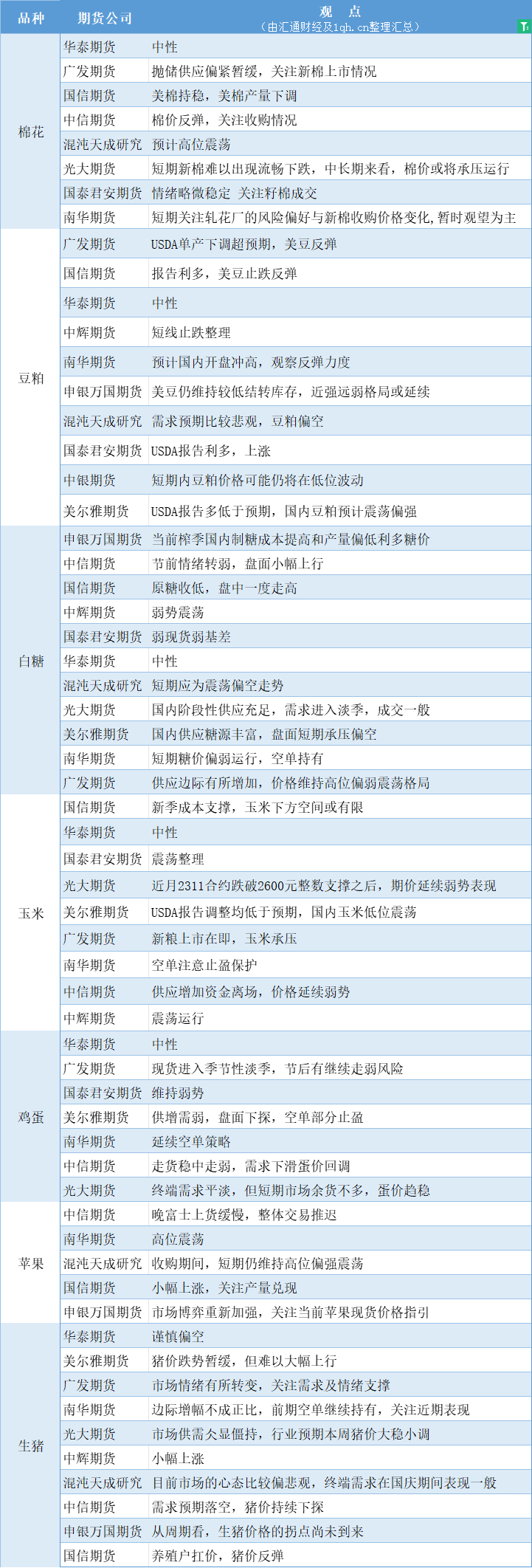 标题:期货公司观点汇总一张图:10月13日农产品(棉花、豆粕、白糖、玉米、鸡蛋、生猪等)