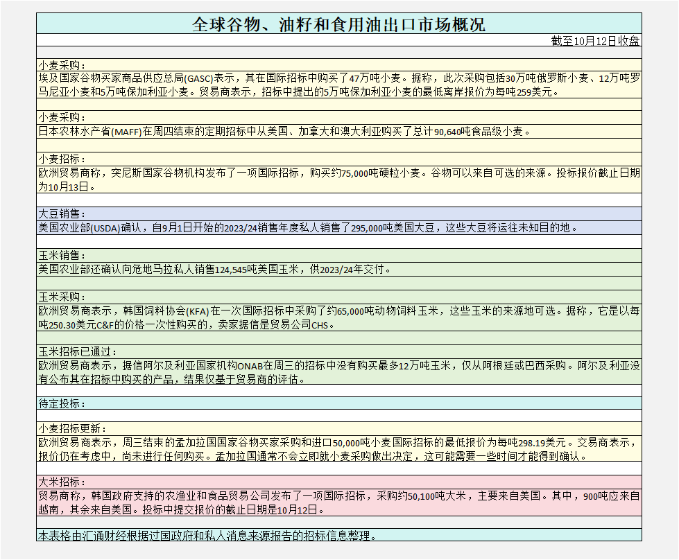 截至周四收盘,多国政府和私人消息来源报告的全球谷物、油籽和食用油出口市场概况: