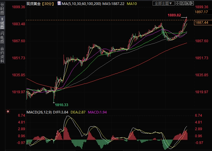 现货黄金持续反弹,日内接连突破1870以及1880两大关口,最高触及1888美元,为9月27日来最高水平,日内涨幅达到20美元,超过1%。