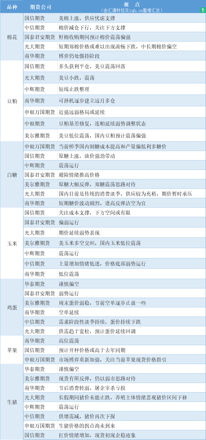期货公司观点汇总一张图:10月16日农产品(棉花、豆粕、白糖、玉米、鸡蛋、生猪等)