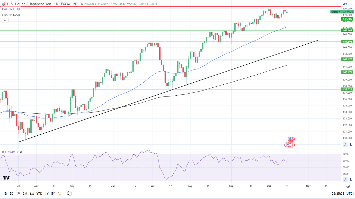 汇通财经APP讯——周一(10月16日)亚市早盘,美元/日元交投于149.50附近,难以坚定突破150大关,尽管技术分析展望,多头目标价望向151。美联储鹰派与日本央行鸽派的拉锯战持续发生,货币政策分歧仍然坚定地偏向美元。但是,巴以冲突和日元干预的威胁挥之不去,继续缓冲日元下行空间。市场风险情绪和鸽派的美联储言论,也正在测试买家对美元的兴趣。