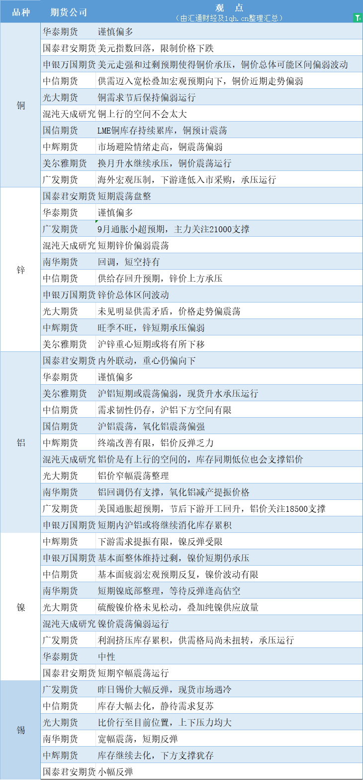 期货公司观点汇总一张图:10月17日有色系(铜、锌、铝、镍、锡等)