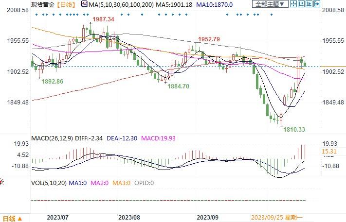 现货黄金目前交投在1915美元附近。上周五,我们看到了一个极端的上行走势,而这样的走势通常预示着某种均值回归。黄金可能仍将是寻求逢低买入的交易员关注的焦点。如果中东紧张局势继续升级,短期内做空黄金的结局可能不会太好。投资者也在关注这场冲突是否会波及其他国家,这有可能进一步推高油价,给世界经济带来新的打击,这也势必影响到主要经济体的利率调升周期有望停止下来。但有银行分析认为,如果情况是孤立的,而没有出现蔓延,那么一些避险需求可能会解除,那么黄金上涨后劲就会变得不足。本周还有值得关注的方面就是晚些时候美联储主席鲍威尔的讲话,投资者都希望能从中寻找有关美国利率前景的线索。丹斯克银行首席分析师说:“以色列和哈马斯之间的冲突仍在继续,传统的避险资金流入给金融市场带来了波动。这与全球货币政策的更高利率持续更长时间的主题相违背。”本周来看,投资者一方面关注中东局势的发展,另一方面关注美国的货币政策。就看这两股影响力量的拔河谁会占优。