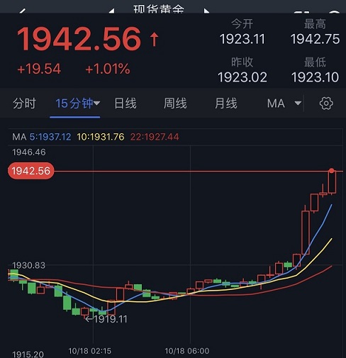 汇通财经APP讯——周三(10月18日)亚市盘中,现货黄金短线大幅攀升,金价已经突破1940美元/盎司关口,截止10:30,最高触及1942.75美元/盎司,日内大涨近20美元。