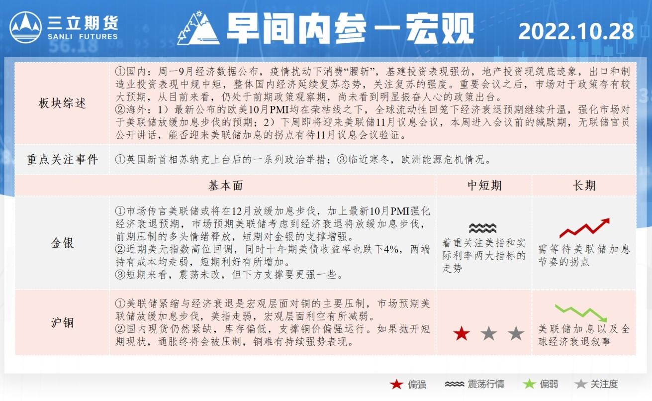 三立期货早间内参显示,金银中短线偏向震荡,着重关注美指和实际利率两大指标走势,长线略微偏多,等待美联储加息节奏拐点;沪铜中短线略微偏多,长线偏空,关注美联储加息和全球衰退叙事。