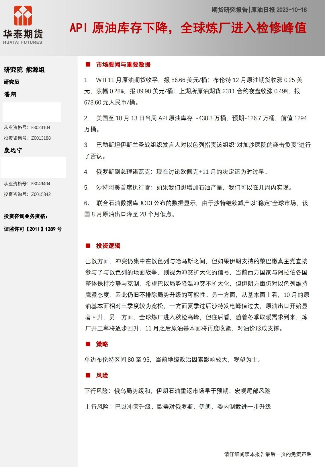 标题:华泰期货10月18日原油日评:API原油库存下降,全球炼厂进入检修峰值