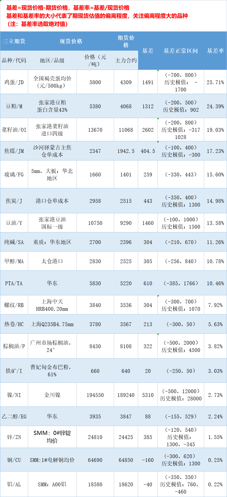 三立期货10月28日基差:一张图尽览有色金属、黑色系、能源化工和农产品基差(按基差率从大到小排序)——排名前三的期货品种分别是鸡蛋、豆粕、菜籽油,基差率分别是25.71%、24.39%、19.03%。