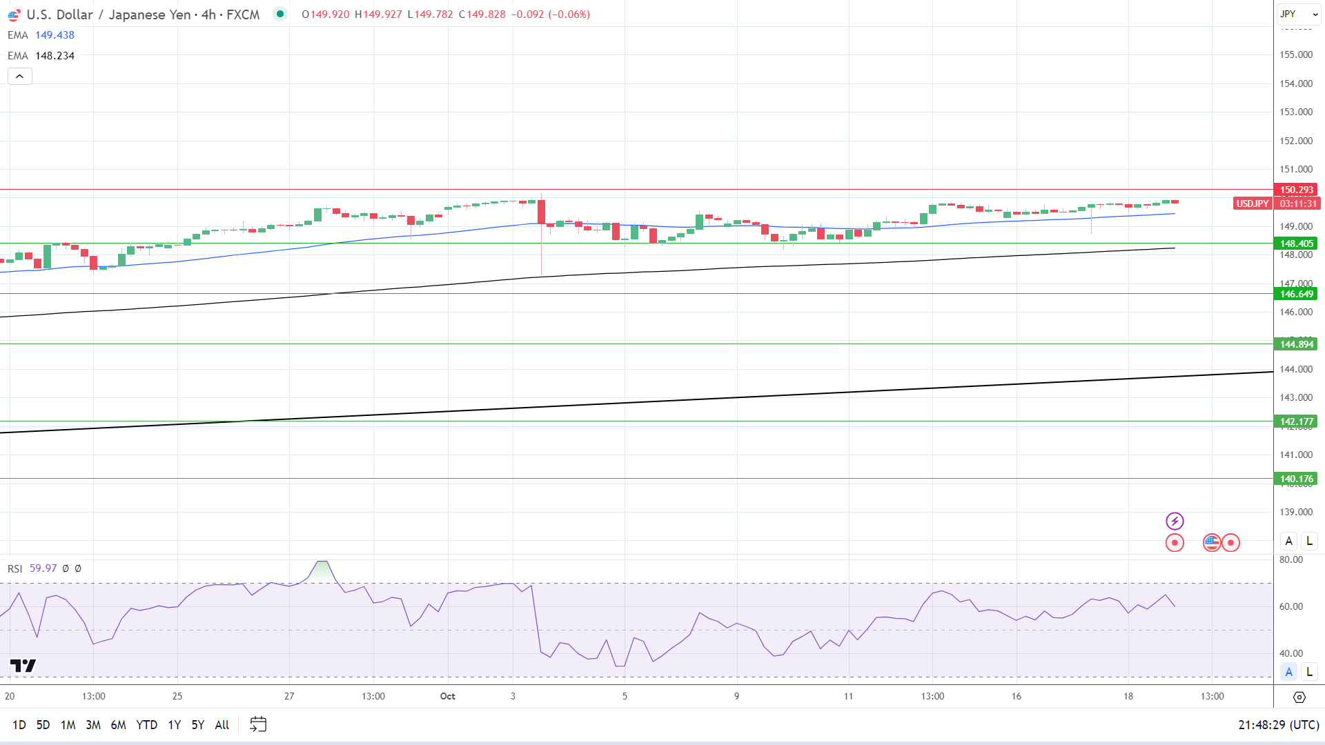 14-4小时RSI为59.97,表明美元/日元在进入超买区域之前将升至150.293阻力位。