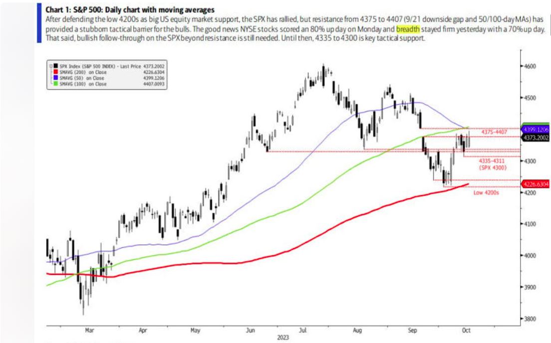 Hartnett认为,这一切都表明,假设10年期美国国债收益率保持在5%以下,标准普尔500指数4,200点的支撑位现在代表着年底前股价的“第四季度硬底”。标准普尔500指数在10月初成功测试了4,200点的支撑位。