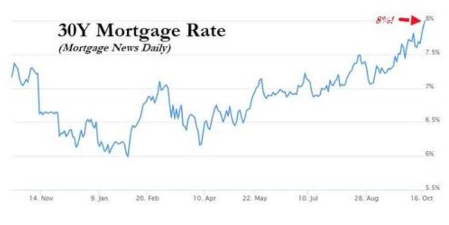汇通财经APP讯——周三(10月18日),根据Mortgage News Daily的数据,市场流行的30年期固定抵押贷款利率的平均值达到8%,这是2000年中期以来的最高水平。