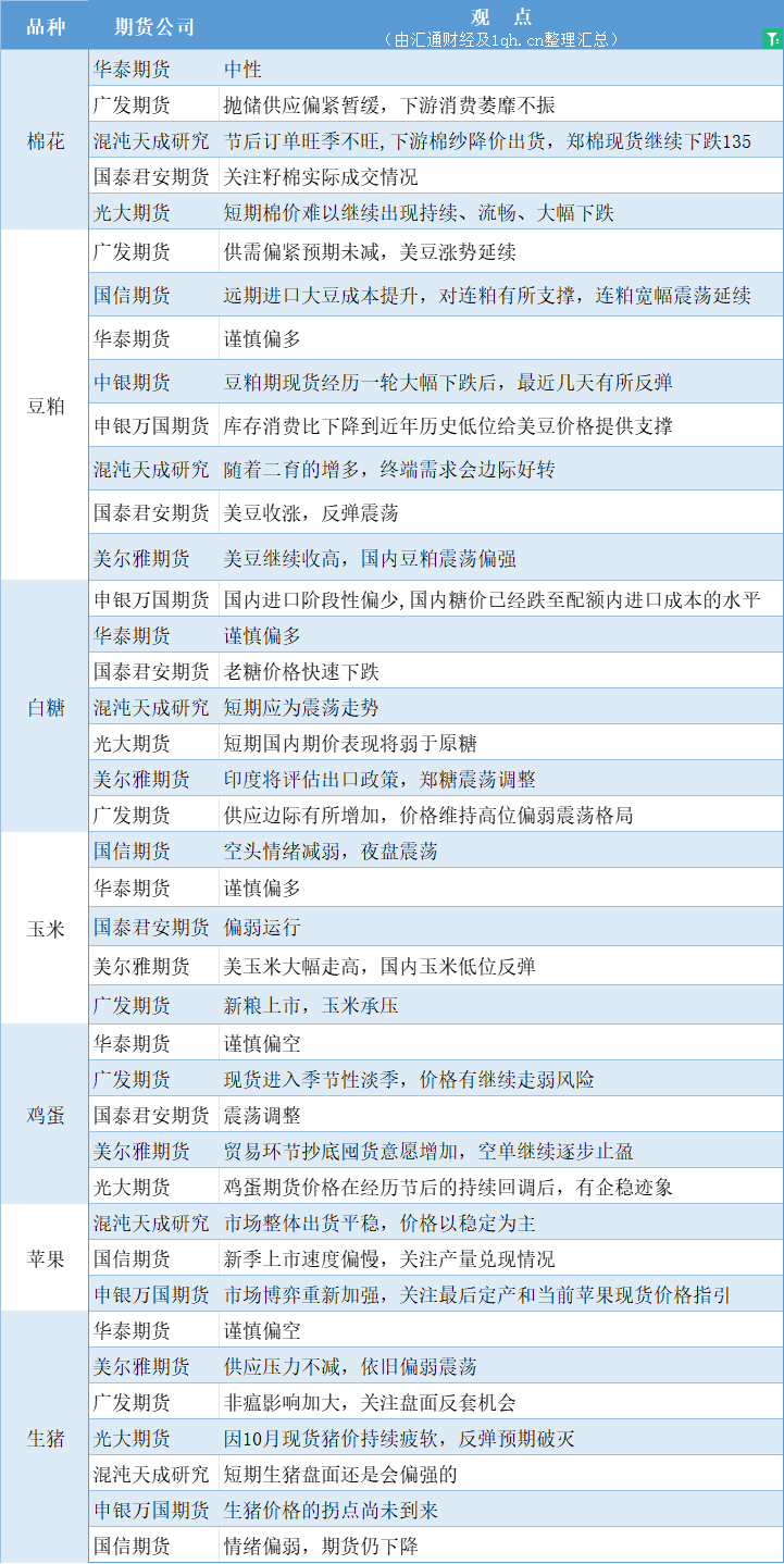 期货公司观点汇总一张图:10月20日农产品(棉花、豆粕、白糖、玉米、鸡蛋、生猪等)