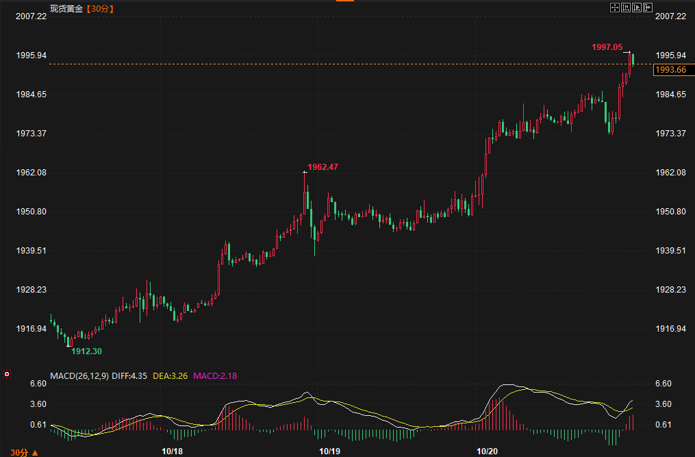 现货黄金上涨0.79%,至1,990.06美元/盎司,创7月20日以来新高。