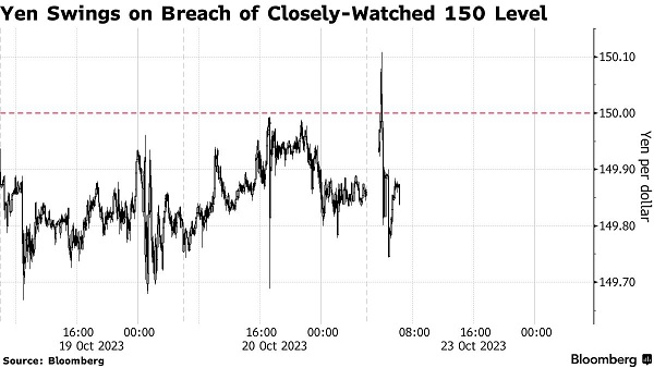 汇通财经APP讯——周一(10月23日)亚市盘初,日元汇率一度短暂跌破1美元兑150日元,原因是日本和美国之间巨大的收益率差距持续压制日元,这让交易员对东京当局可能采取的干预措施保持警惕。