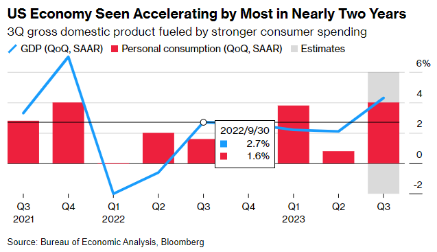 根据彭博社对经济学家进行的调查,预计美国国内生产总值(GDP)在7月至9月将以4.3%的年化速度增长。这种增长表明,相较于欧洲停滞不前和亚洲应对亚洲大国经济问题的情况,美国仍然是全球经济的强大引擎。