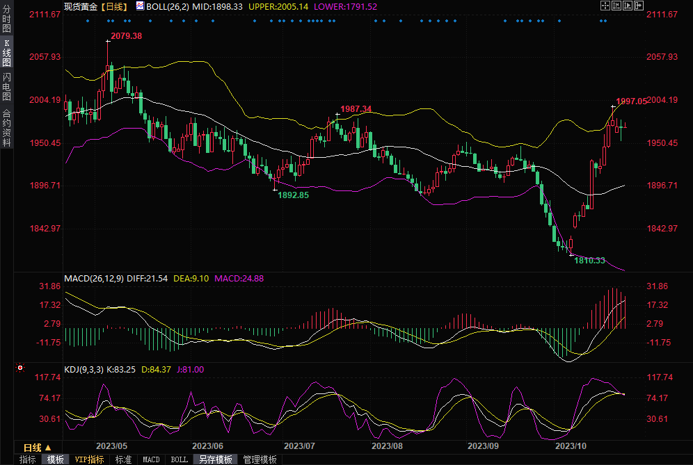 美国10月初步经济数据显示制造业和服务业均扩张,经济活动好于预期,金价周二一度承压至1953美元附近,但由于逢低买盘支撑,金价收复了全部跌幅,周三(10月25日)亚市,金价目前交投于1971.84美元/盎司附近。。