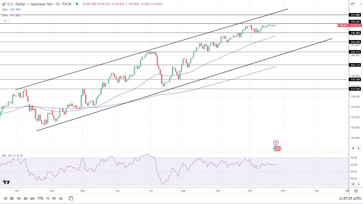 汇通财经APP讯——周三(10月25日)亚市早盘,美元/日元继续在149.88附近盘旋,显示交易员难逃日本央行在150关口出手干预汇市的威胁。但市场分析展望,周五情况可能会发生变化,美国通胀成为焦点,可能将打破汇市僵局,在进入超买区域前,带领美元/日元升破150门槛。