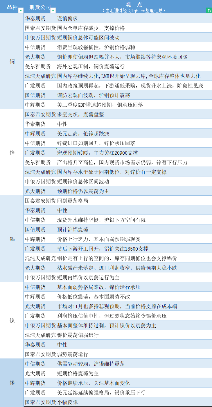 期货公司观点汇总一张图:10月27日有色系(铜、锌、铝、镍、锡等)