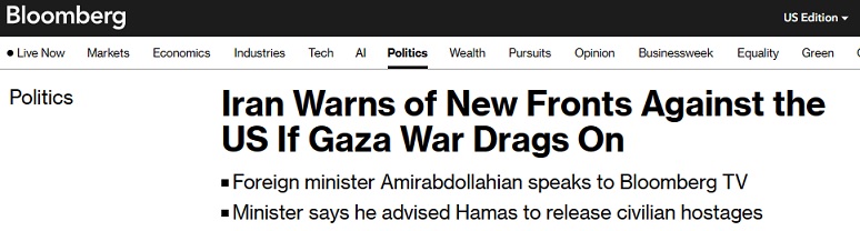 阿卜杜拉希扬在接受彭博电视台采访时表示:“美国建议其他国家保持自我克制,但它完全站在以色列一边。如果美国继续目前的做法,那么针对美国的新战线将被开辟出来。”