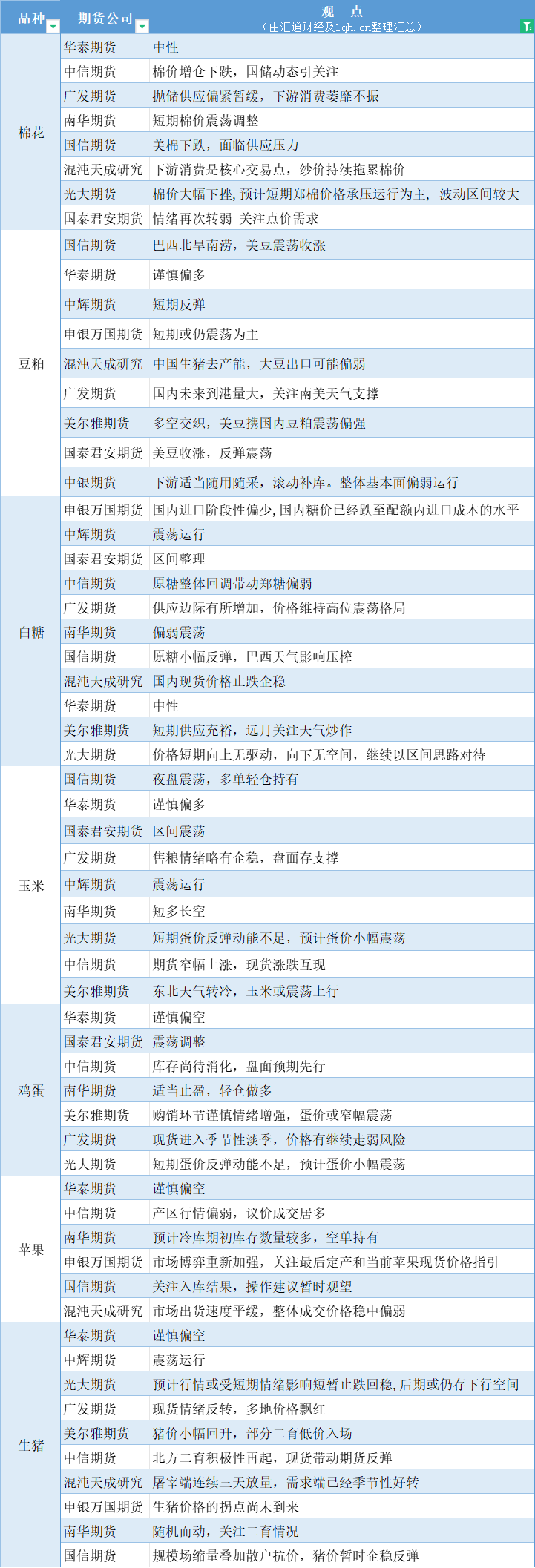 期货公司观点汇总一张图:11月1日农产品(棉花、豆粕、白糖、玉米、鸡蛋、生猪等)