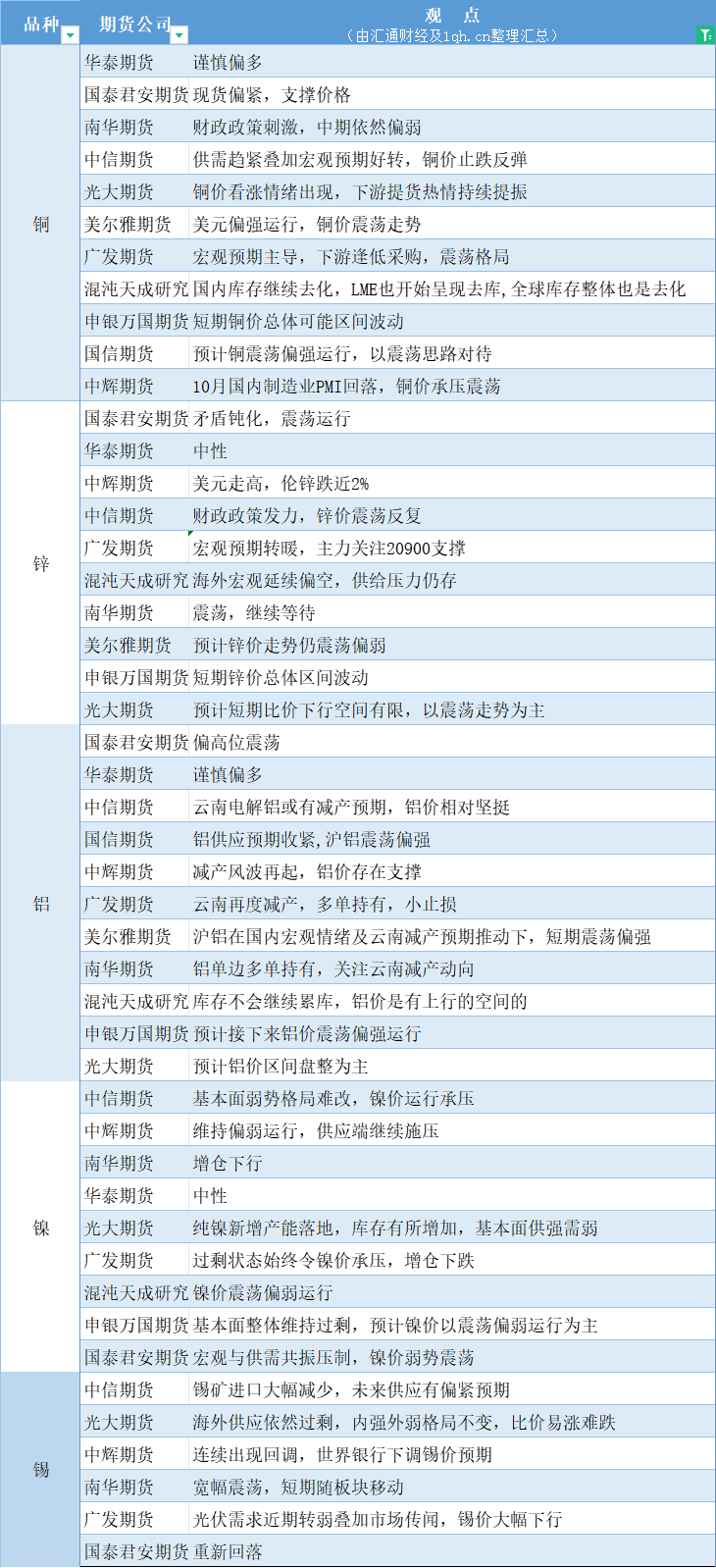 期货公司观点汇总一张图:11月1日有色系(铜、锌、铝、镍、锡等)