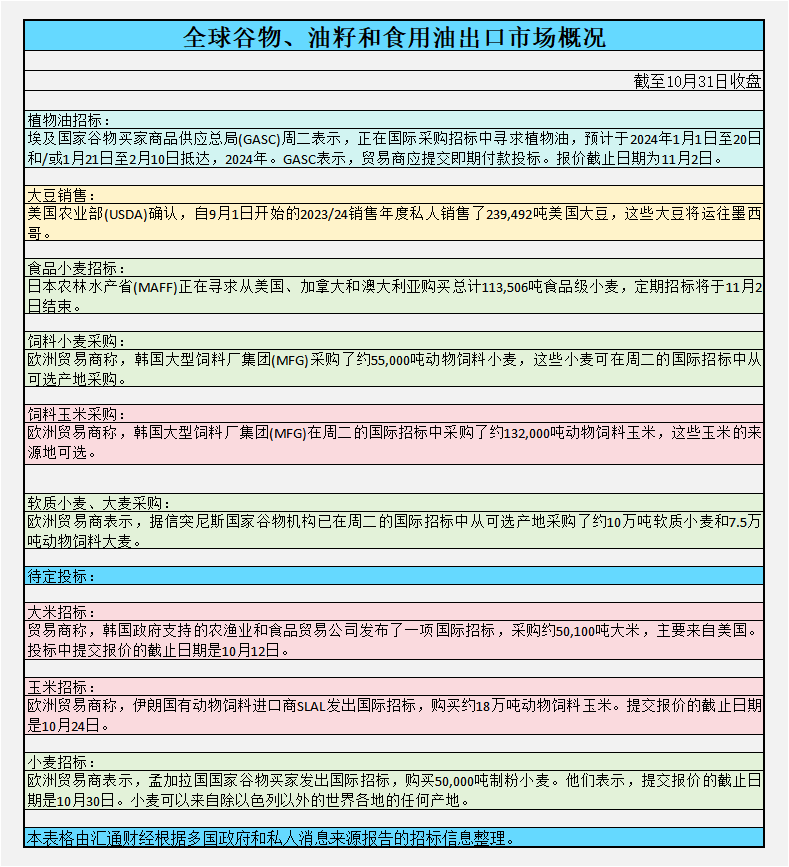 欧盟数据显示,截至10月29日,自2023/24产季7月开始以来,欧盟软小麦出口量为961万吨,同比下降24%。