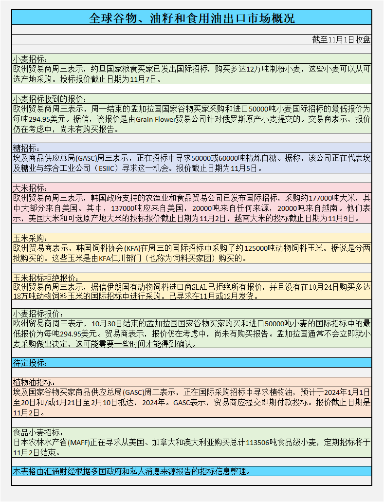需求方面截至周三收盘,政府和私人消息来源报道的全球谷物、油籽和食用油出口市场概况: