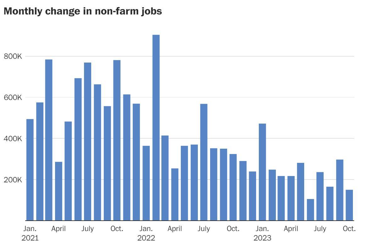 今年,许多行业的劳动力市场都在经历显着的降温,从疫情爆发后的最高峰开始,当时雇主迅速创造了数百万个就业岗位,以满足被压抑的消费者需求。10 月份的就业增幅创下 2020 年以来的第二低增幅。经济学家此前预测 10 月份经济创造了约 17 万个就业岗位。
