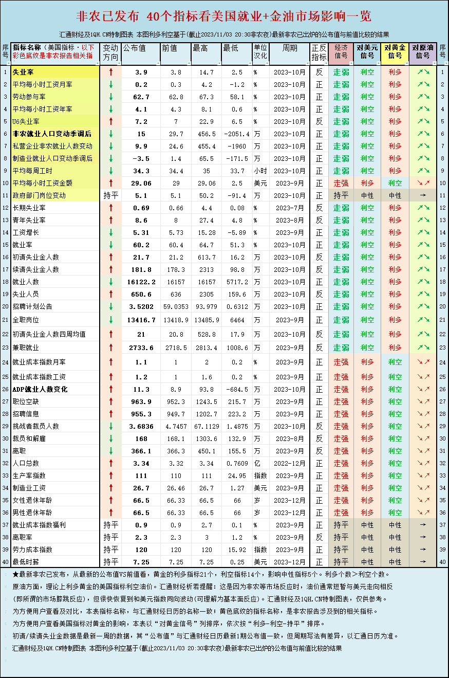 汇通财经APP讯——一张图:非农已发布 40个指标看美国就业+金油市场影响一览:周五(11月3日)20:30数据显示,美国10月非农仅新增15万,预期增加18万,前两个月合计下修近7万,时薪及每周工时等均差于预期。美国10月失业率意外升至3.9%创2022年1月以来最高。整体报告打压了美联储12月加息的预期,最后紧缩的必要性减弱,提升市场风险情绪。美国投资者看10月非农:数据表明美国经济衰退即将到来,但市场乐见其成。