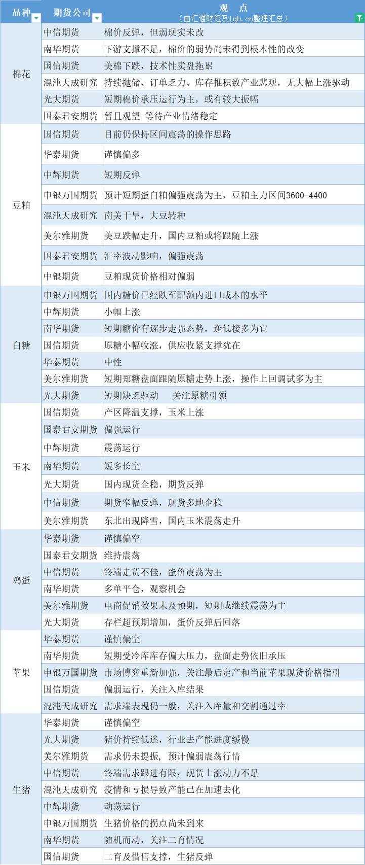 标题:期货公司观点汇总一张图:11月6日农产品(棉花、豆粕、白糖、玉米、鸡蛋、生猪等)