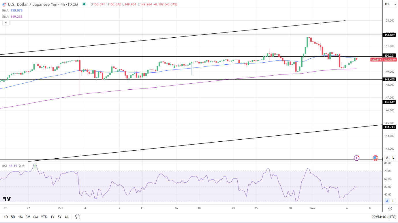 14周期4小时RSI为48.19,表明美元/日元在进入超卖区域之前将跌破200日均线。