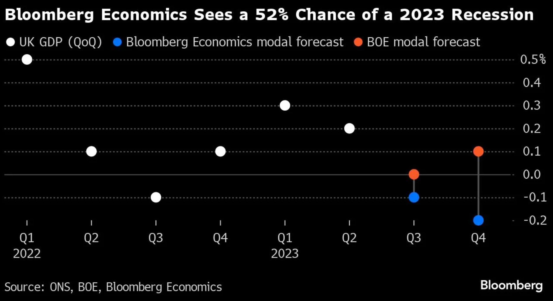彭博经济研究公司(Bloomberg Economics)的模型(该公司已预测出现温和衰退)显示,继 7 月份 GDP 下降 0.6% 后,第三季度出现收缩的可能性为 70%,而 8 月份仅出现部分反弹。英国央行上周估计,在其预测期内出现经济衰退的可能性为 50%。