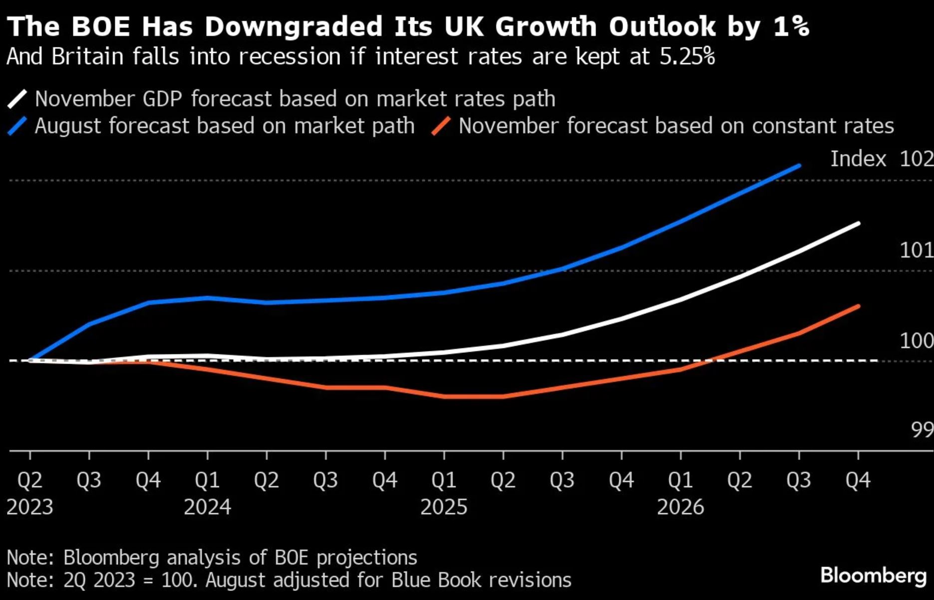 截至上周五下午,彭博社的一项调查显示,经济学家预测截至9月份的三个月内GDP将下滑0.1% 。英国央行预计,目前失业率为4.3%,到2026年将升至5.1%。